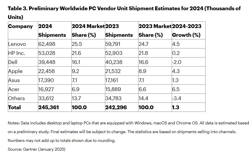 另一家市場(chǎng)分析公司Gartner的最新報(bào)告顯示,2024年第四季度全球PC出貨量總計(jì)6440萬(wàn)臺(tái),較2023年第四季度增長(zhǎng)1.4%——這是出貨量連續(xù)第五個(gè)季度持續(xù)增長(zhǎng);2024年全年P(guān)C出貨量達(dá)到2.453億臺(tái),較2023年增長(zhǎng)1.3%,意味著全球PC市場(chǎng)的復(fù)蘇仍在持續(xù)。